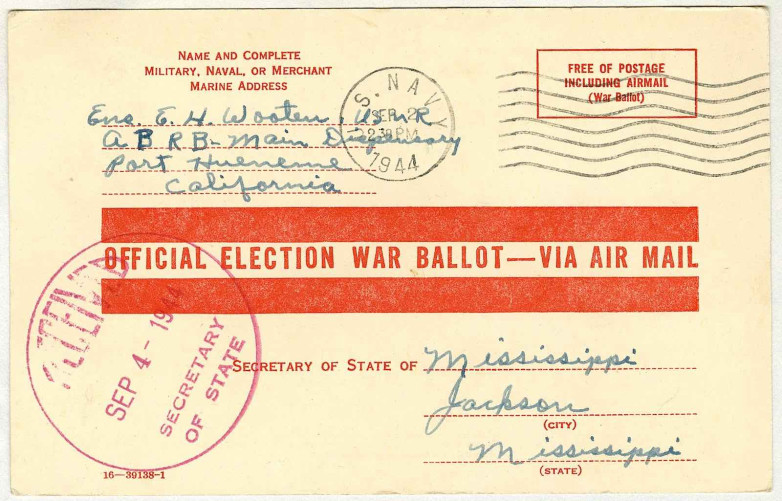 - World War II absentee voting materials developed for U.S. Armed Forces, including the design of a blank ballot allowed the government to distribute them before specific candidate names became available, thus accommodating weeks-long mailing time for U.S. forces overseas