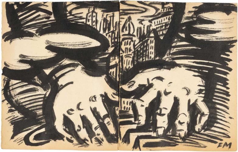 Frans Masereel drawing on the verso of artwork for an unpublished graphic novel, Chansons Sentimentale, offered at PBA Galleries this week.