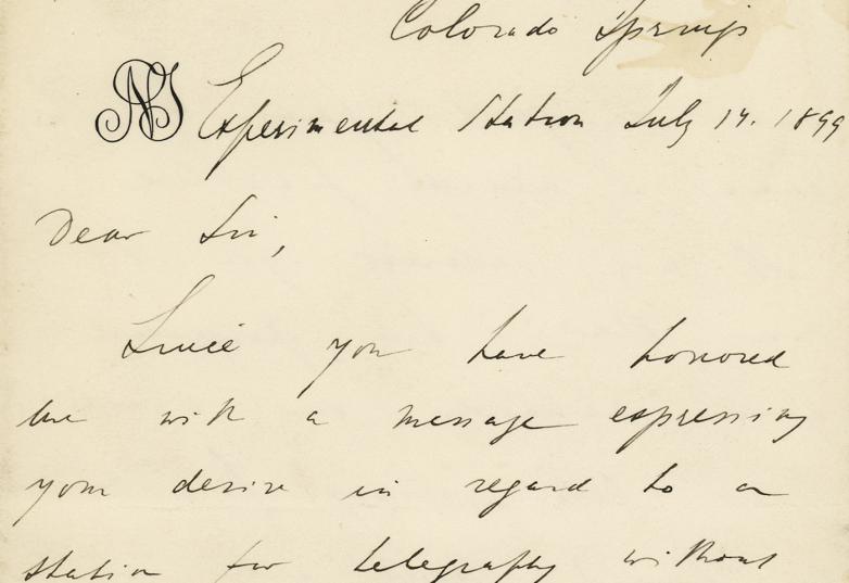 In the four-page letter on personal monogram letterhead, dated July 14, 1899. Handwritten letter to Rear Admiral Francis J. Higginson by Nikola Tesla, penned from his "Colorado Springs Experimental Station." Tesla insists his wireless technology is superior to Marconi's: "I am now looking with full confidence to the establishment of a communication with the European continent."