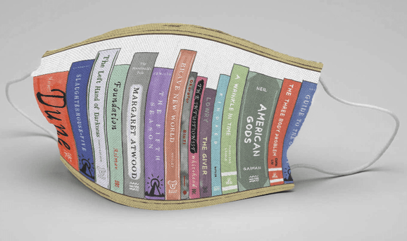 And speaking of covered … face coverings, our necessary new accessory in the age of Covid-19, are also now offered by Litographs. Masks with quotes; masks featuring shelves of colorful books; masks that make it look as though your mouth is shield by a page of typewritten text. Why not? Each mask is reusable and costs $14.99. The “Science Fiction” shelf mask is pictured here.