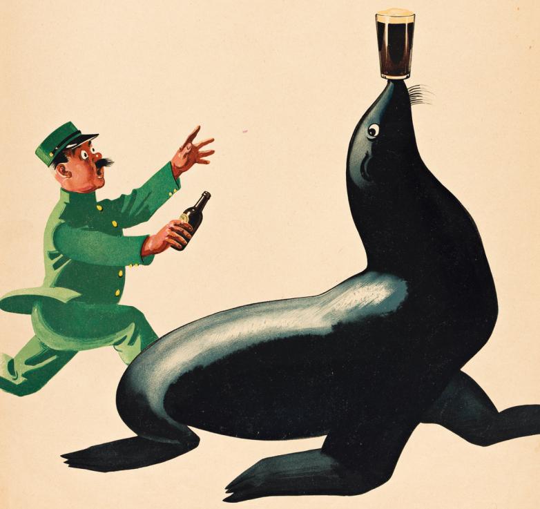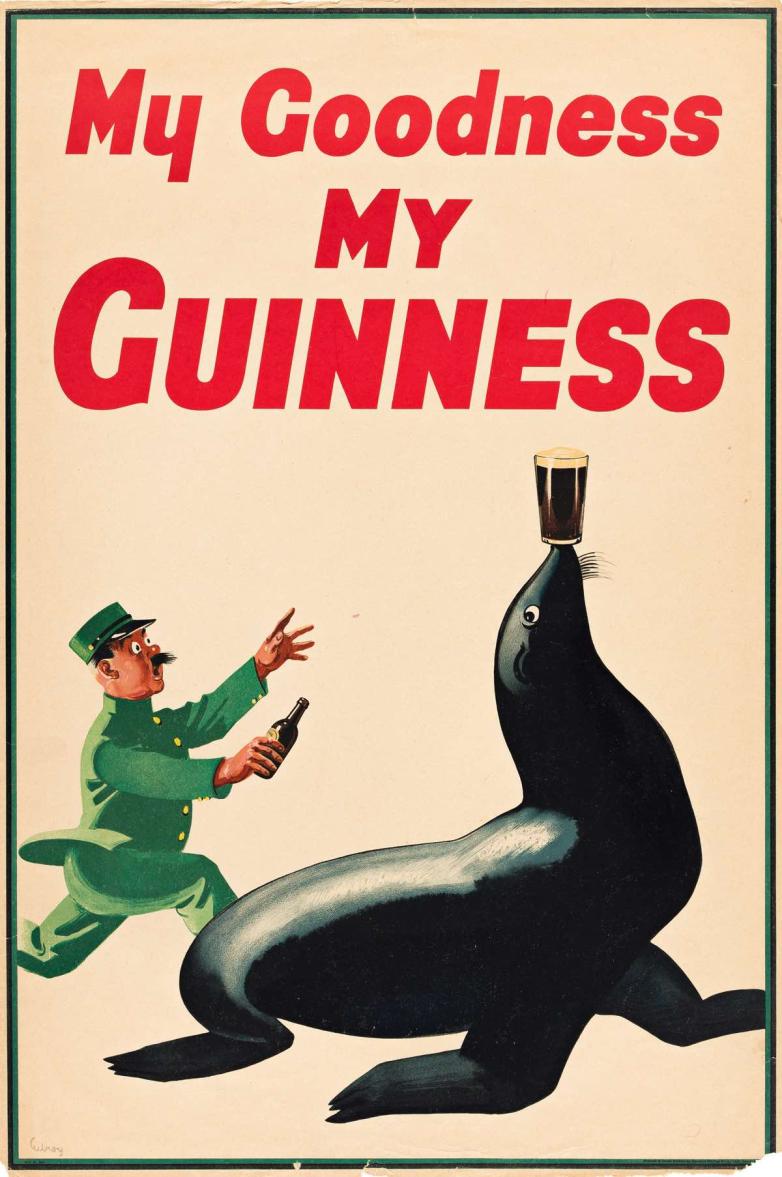 Many of the posters in this collection were designed by John Gilroy (1898-1985), who worked for the Irish brewery from 1928 to the 1960s. According to the company, Gilroy was inspired by a sea lion that he believed was smart enough to balance a pint of stout on its nose. That was the concept behind the long-lived “My Goodness, My Guinness” campaign. His 1935 sea lion poster is among those offered at Swann, estimated at $700-1,000, as are other Gilroy animals, including a toucan, an ostrich, and a turtle who encourages you to “Have a Guinness when you’re Tired.”
