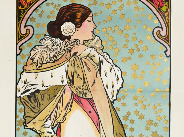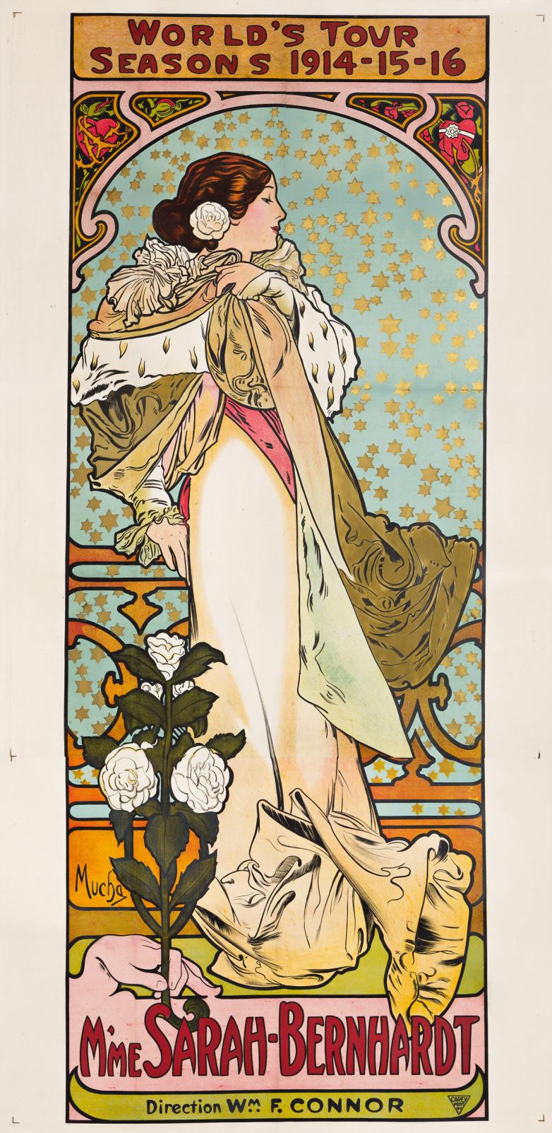 Detail from Alphonse Mucha, MME Sarah – Bernhardt / World’s Tour Seasons 1914–15–16. Estimate: $4,000-6,000.