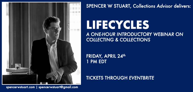 Spencer W Stuart, Collections Advisor, is pleased to announce a one-hour webinar on Lifecycles: Collecting & Collections. The one-hour webinar will be drawing from my three-part Lifecycles program that focuses on collecting fine art and private libraries.