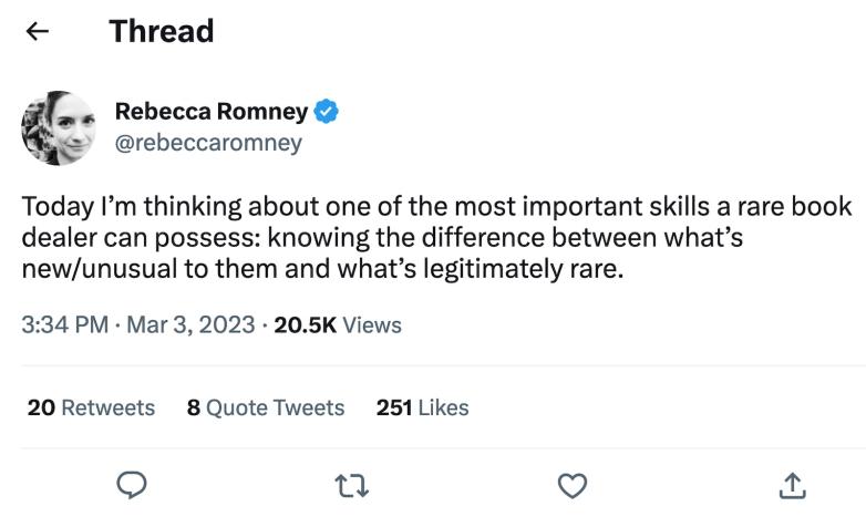 Rebecca Romney, rare book dealer and collector at Type Punch Matrix, has shared her thoughts on Twitter about what she describes as "one of the most important skills a rare book dealer can possess: knowing the difference between what’s new/unusual to them and what’s legitimately rare."