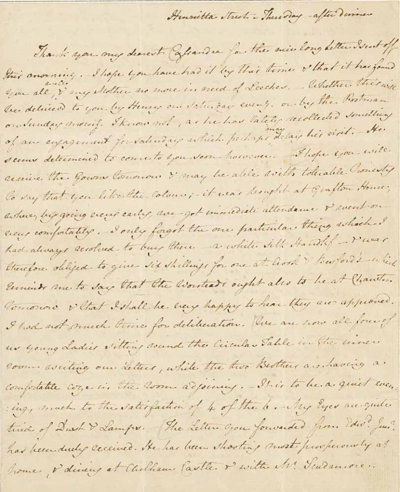 "We are now all four of us young Ladies sitting round the Circular Table in the inner room writing our Letters, while the two Brothers are having a comfortable coze in the room adjoining," Austen wrote in the letter.
