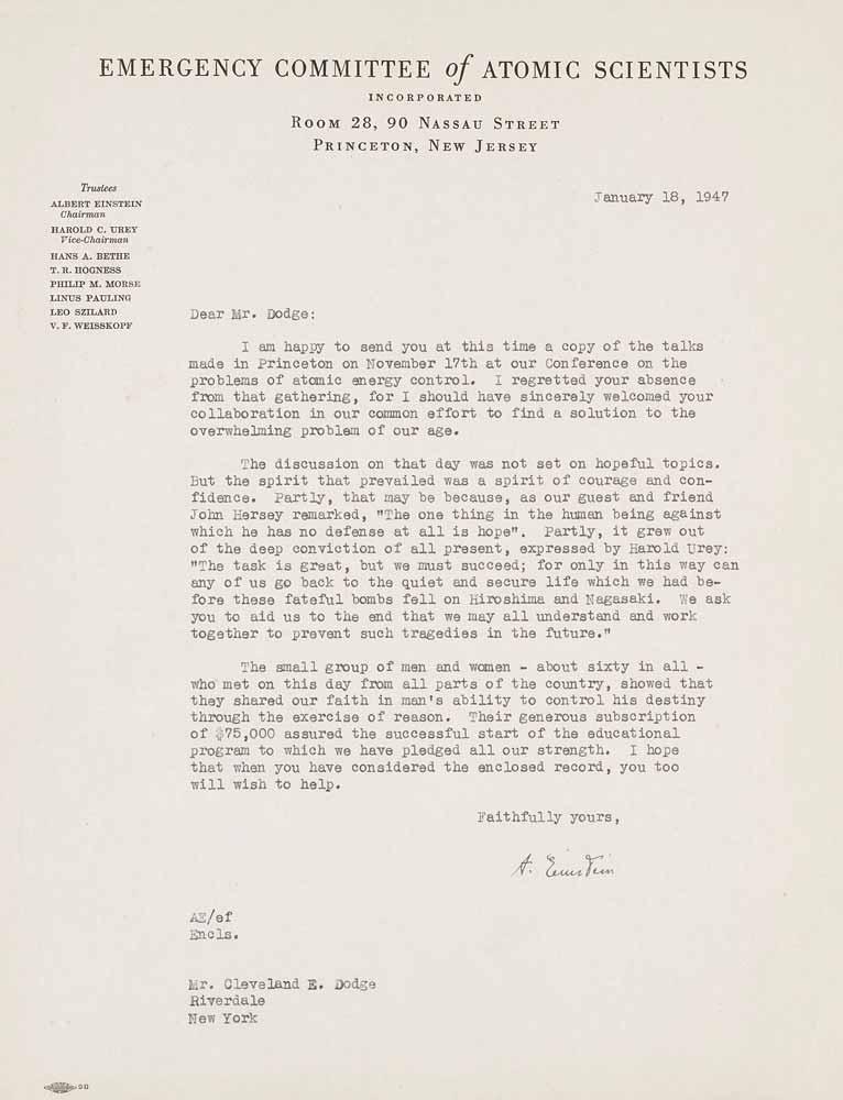 A 1947 letter from Albert Einstein to Cleveland E. Dodge about the Emergency Committee of Atomic Scientists, estimated at $30,000-$50,000.