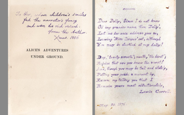 Left: Carroll inscribed this copy of Alice’s Adventures Under Ground to Lorina Liddell in 1886. Right: A letter from Carroll to Dolly Draper from 1876.