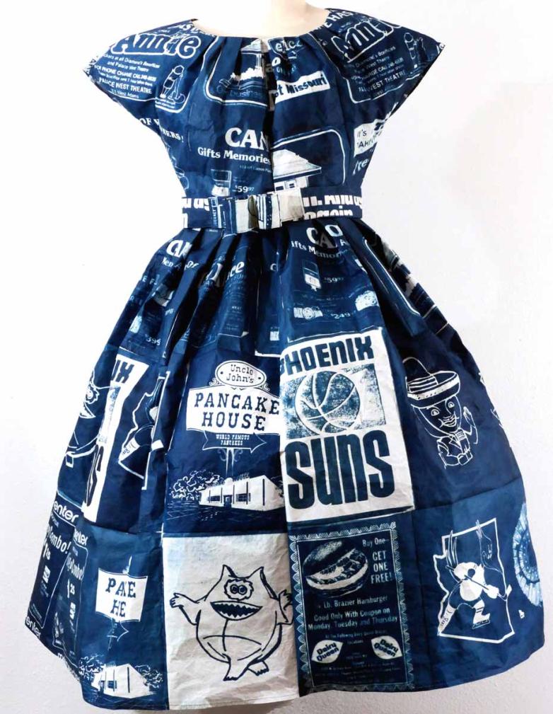 The Arizona-based Annie Lopez, whose works explore personal history and memory, relies on her own highly involved process. Lopez sews dresses that appear fashioned from fabric but are in fact constructed out of parchment-like tamale wrappers. They are also photographs: specifically, cyanotypes, with each blue print capturing images and texts from paper mementos, such as old advertisements and restaurant menus. Lopez has been printing on tamale paper for a decade, ever since she chanced upon the sheets in a grocery store. “The paper spoke to me,” she said. “I’m of Mexican descent, and my family used to make tamales, so it connected to my culture—it made the work a bit more ‘me.’”
