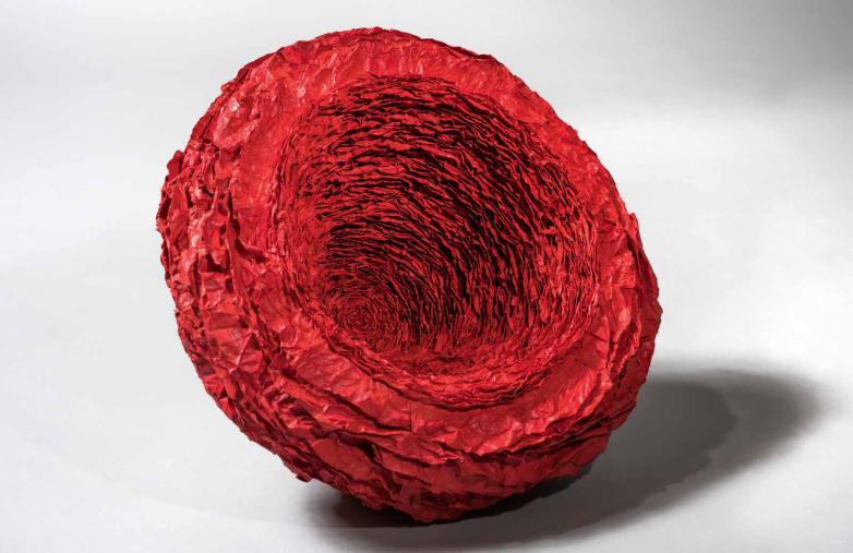 Often, paper is so disguised by the artist’s hand that it is nearly unidentifiable. Echiko Ohira’s sculptures, which can resemble organic forms, from a monumental mushroom cap to a bird’s nest, can appear at a glance to be carved from wood, so precise and structured are their contours. But the artist works with thin paper that she stains with tea, then twists, tears, stacks, and sews into her final, fluid shapes.