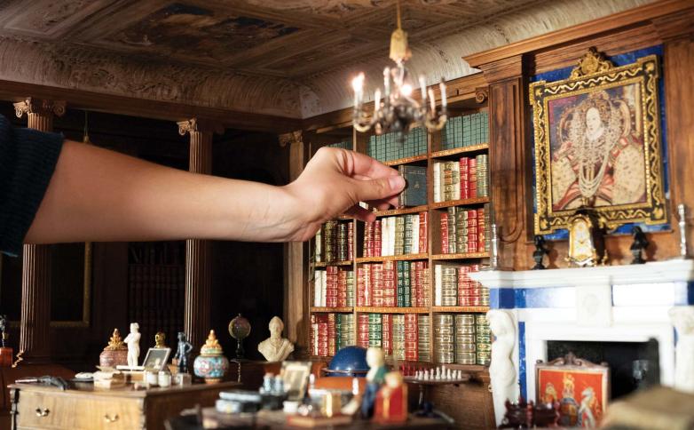 As well as a doll-sized leather-top desk, ivory paper knife, leather-upholstered armchairs, and miniature bronze busts of German writers Friedrich Schiller and Johann Wolfgang von Goethe, the library is stocked with 595 miniature books, 176 of which are handwritten manuscripts. These were commissioned by the Princess and her friend, the writer E. V. Lucas, from the country’s leading authors, including Max Beerbohm, A. A. Milne, and J. M. Barrie. Edith Wharton also contributed an original poem, Elves’ Library. The writers were sent four-centimeter-high blank notebooks in which they wrote their contributions. (Rudyard Kipling also decorated his selection of verses with pen-and-ink drawings.) The notebooks were then bound by Sangorski & Sutcliffe, Rivière & Son, Zaehnsdorf, and Birdsall & Son in leather with gold tooling and finished with bookplates designed by E. H. Shepard.