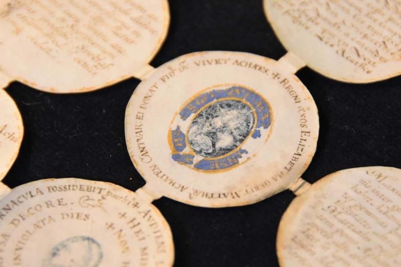 Two of the roundels are illustrated after the agate intaglios of George and the Dragon and the Queen's cameo. Surrounding the images are Latin phrases extolling learning and loyalty, and praising the beauty of her Majesty. Parker’s description of himself as the Queen’s ‘fidus Achates’ was carefully chosen to emphasise his devotion to the monarch and to strengthen his royal backing during a time of crisis for the Church. The remaining roundels describe in Latin and French the various qualities of agate, including its ability to repel scorpions and its value as a precious gem.