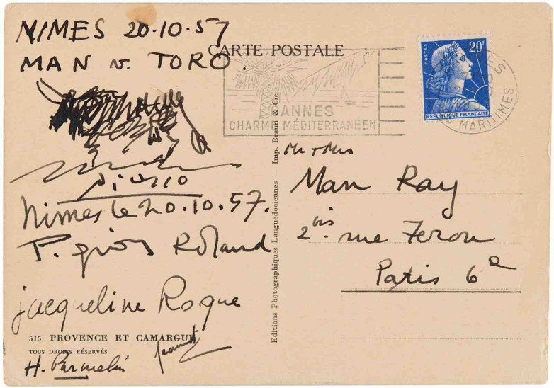 Signed and titled Man v. Toro on a postcard addressed to Man Ray, who photographed him during the 1920s and 1930s, it is executed in ink and co-signed by Picasso's second wife Jacqueline Roque, and various French artists and journalists including Edouard Pignon, Hélène Parmelin and Roland Penrose. On the reverse of the 6 x 4 postcard addressed to Man Ray's studio in Paris is a picture of horses in Provence et Camargue. The date is marked "20.10.1957".