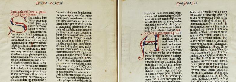 The Bible was printed by Johannes Gutenberg in Mainz, Germany from 1450-1455. There are less than 50 complete or near-complete copies of the Gutenberg Bible extant, with nearly all those housed in public institutions. Singular leaves are also scarce, with the leaf presented here having been acquired by bookseller Gabriel Wells, whose purchase of an incomplete Bible in 1920 gave way to selling the individual leaves alongside an essay by A. Edward Newton entitled ''A Noble Fragment.’’ The leaf is number 193 of the full Latin Bible, with the recto being the Prologue to 1 Chronicles of the Old Testament, and the verso the first part of Chapter 1 of 1 Chronicles. Each page features two columns of 42 lines in dark black Gothic type, accented by red and blue rubrication. Each copy of the Gutenberg Bible differs in its rubrication and illumination, with buyers at the time deciding upon these embellishments after the Bible was printed. The six-line rubricated letters of this leaf were likely added later, restored to match the original style.