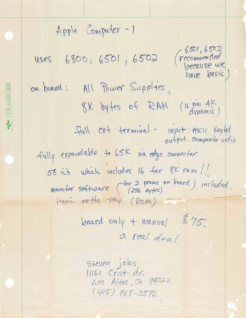 The rough draft specification sheet for the groundbreaking Apple-1 bears Jobs' full signature in lowercase print, "steven jobs." It features contact information, including his parents' home address and phone numbe, historically, the original headquarters of the Apple Computer Company.
