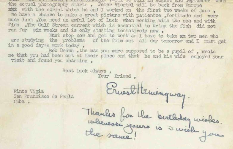 The Raab Collection has unveiled two powerful and revealing Ernest Hemingway letters that touch upon writing, life, filming The Old Man and the Sea, fishing, travel, and, perhaps most importantly, death and the afterlife, including his near-death experience in two airplane crashes. They also shed light on a touching and interesting episode in the life of Hemingway.