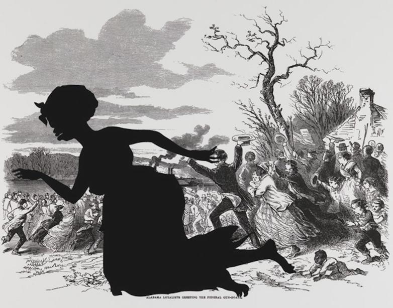 Kara Walker (b. 1969). Alabama Loyalists Greeting the Federal Gun-Boats, from the portfolio Harper’s Pictorial History of the Civil War (Annotated), 2005 Offset lithograph and screenprint on paper. Smithsonian American Art Museum, Museum purchase through the Luisita L. and Franz H. Denghausen Endowment.