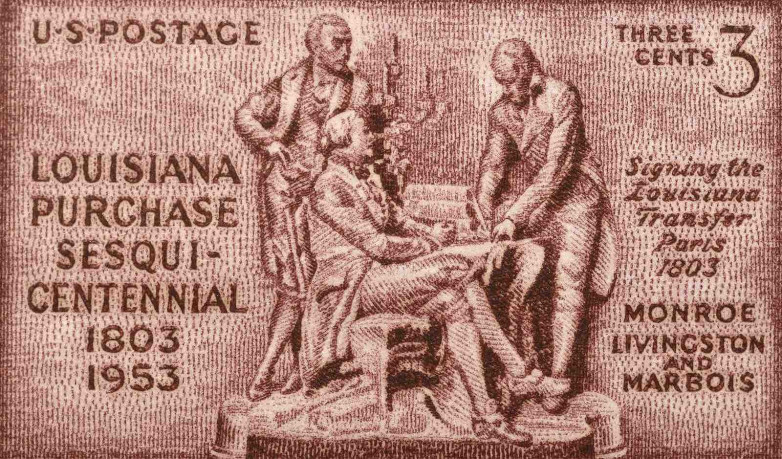 The portfolio is gold-stamped with the name of Francois Barbé-Marbois, the man behind the negotiations, for whom the deal was strategic. As he once reflected on Napoleon’s motivations, the sale was meant to prevent British domination of the Americas: “I shall be useful to the whole universe,” Napoleon wrote, “if I can prevent their [the British] ruling America as they rule Asia.” So momentous was the deal that even 150 years later he was commemorated on an American postage stamp.