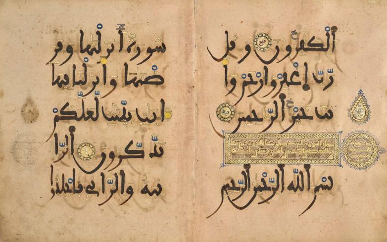 Bifolium from the Pink Qur’an, Spain (Granada and Valencia), 1200s, Qur’an (text in Arabic). Tempera colors, gold, silver, and ink