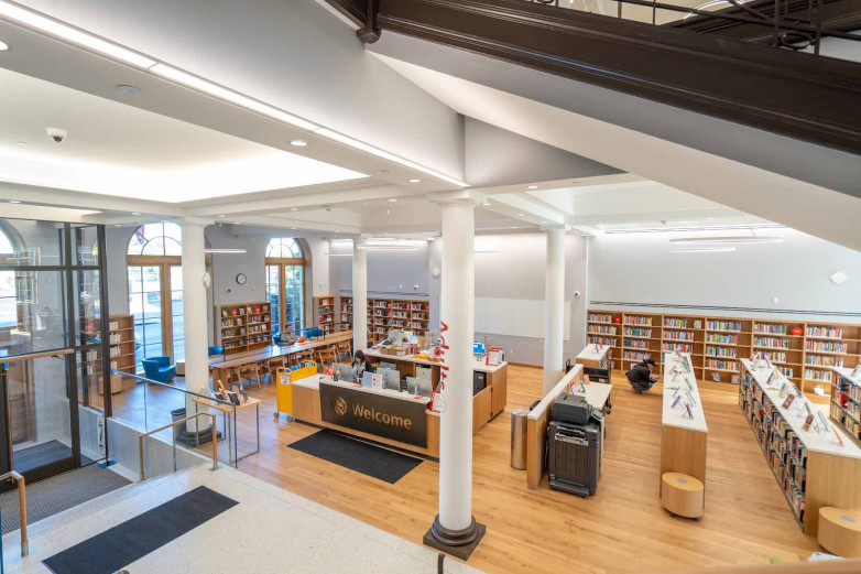 The newly updated branch, a 120 year-old Renaissance Revival building which suffered from leaks, and a dilapidated third floor unfit for public use, now includes technology upgrades, new energy-efficient windows, and new heating and cooling systems for patron comfort, which is especially important given the Library's designation as a gathering place during extreme weather.