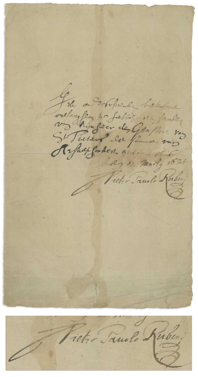 The Peter Paul Rubens autograph note was signed March 1624. During this span, Rubens was completing work on the Marie de' Medici Cycle, the 24 paintings commissioned by Marie de' Medici to hang in the Luxembourg Palace in Paris. They are now currently displayed at the Louvre. The note is an acknowledgement of funds received from ''My lord the Pastor of St. Pieters'' of 1,800 guilders, a large sum of approximately $100,000 in today's value. Given the amount and recipient, the receipt is almost certainly regarding payment for artwork, as various churches commissioned Rubens to paint artworks to be hung in their churches. The note in Dutch is dated March 12, 1624 and is signed ''Pietro Pauolo Rubens'.'