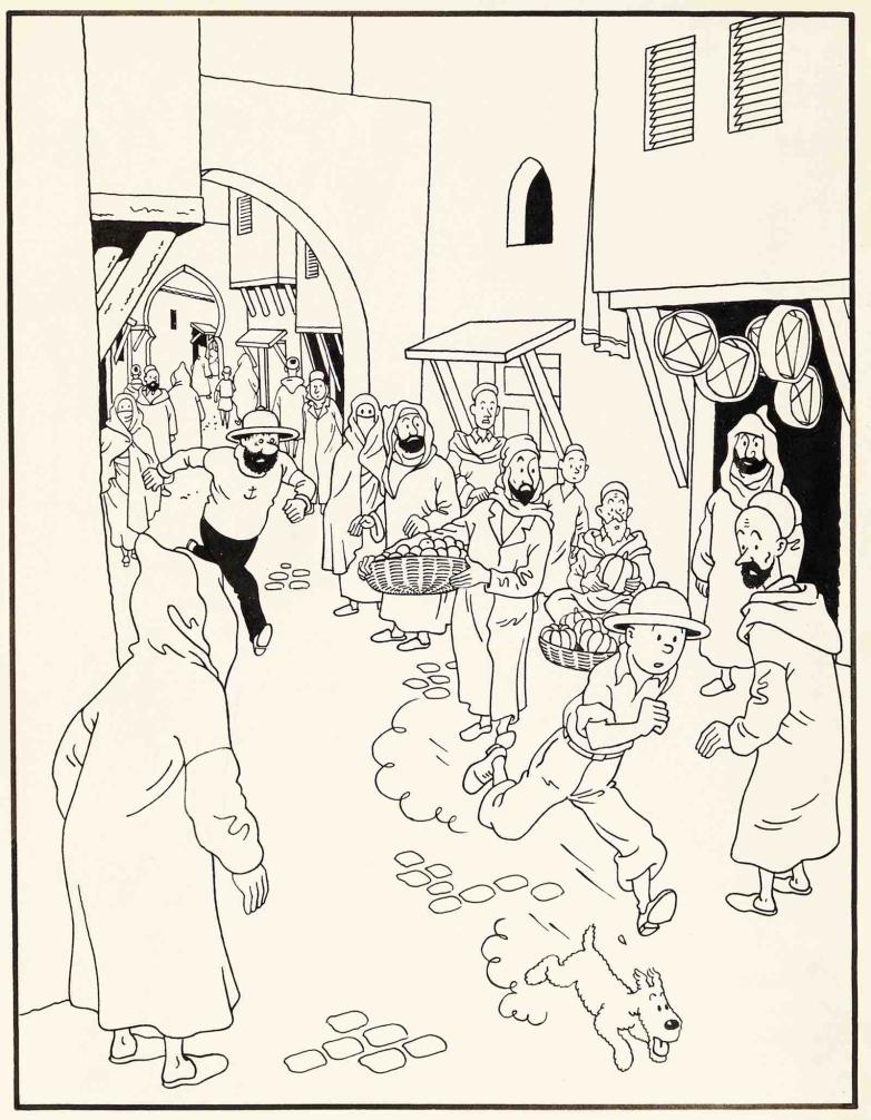 Hergé once said that next to Franquin “I’m only a mediocre pen-pusher.” His creation Tintin is represented in this event by three works, including a 1944 rendering of Tintin and Captain Haddock’s dashing through a Moroccan market.